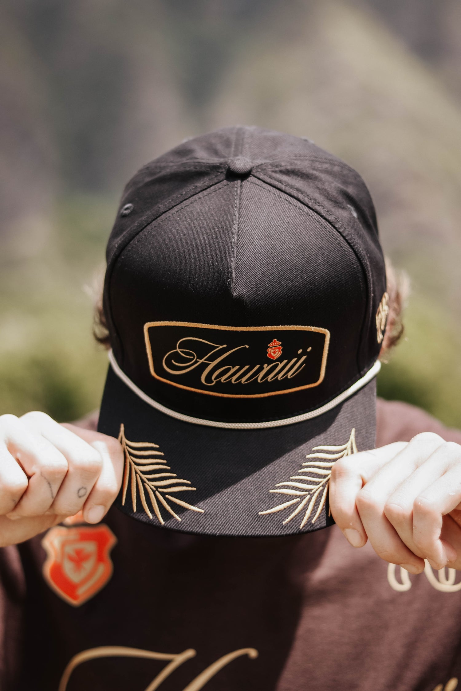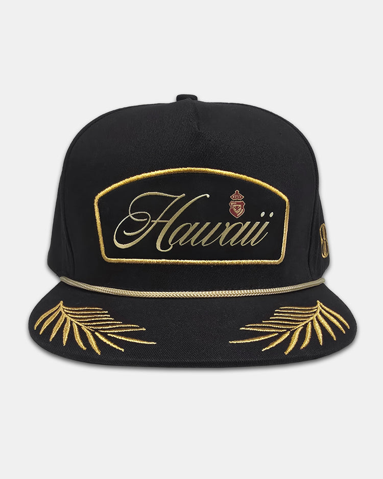 Defend Hawai‘i - Introducing our Hawai'i 78 5-panel snapback. Reminiscing on a captain's hat, the forever golden Hawaii sits boldly embroidered on the crown. Don't miss the gold rope twist across the brim. Featuring a gold embroidered 78 on the side and leaf details on the brim. This one is a cotton snapback hat, with a black crown, black eyelets, black brim, and button with a snap closure.