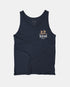 Defend Hawai'i - An ode to our primitave Pioneers, who paved the way of the sea. Featuring a clean pocket hit and a double sail back hit. Pick your favorite color way. This one comes in white, tan, and blue ink on a navy casual fit tank top.