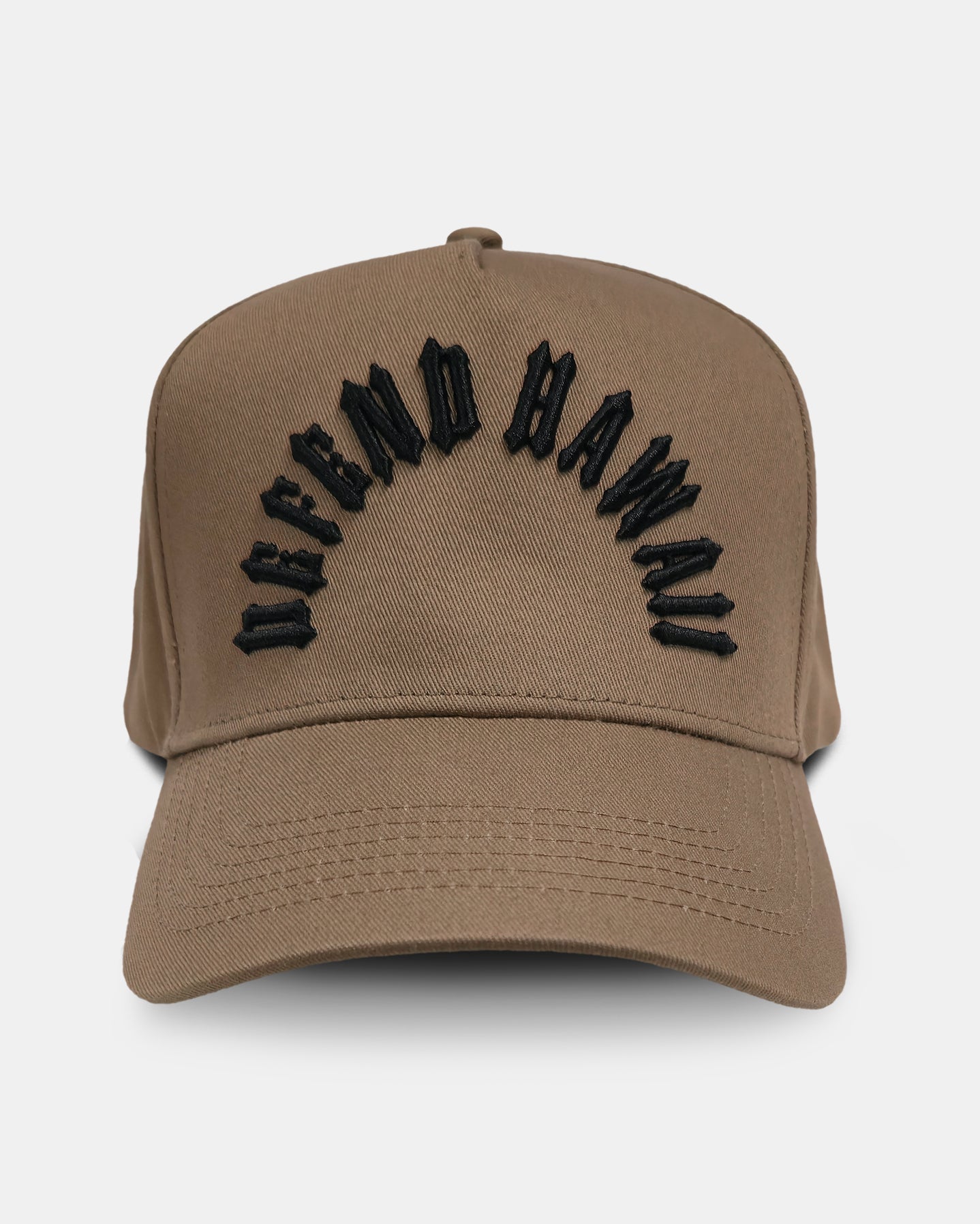 Defend Hawai‘i - A classic look to sit proudly on your crown. The Sunset a-frame snapback. Embroidered in black on a tan a-frame snapback. This one is a tan cotton snapback hat, with a tan crown, tan eyelets, tan brim, and button with a snap closure.