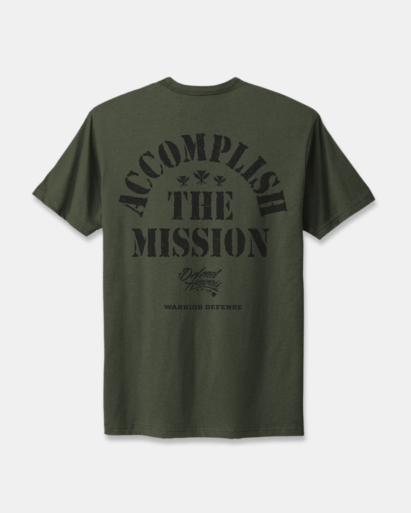 Defend Hawai'i x Rainbow Warrior Defense is back and bolder!  In support of our Home Team defenders, the football defense, and Coach CB, Defend Hawai'i will be donating a portion of the proceeds for each collab product purchased to the UH Football Program. With this one, we ACCOMPLISH THE MISSION. Available in black ink printed on a military green premium fit tee.  This design is also available in a regular tee.