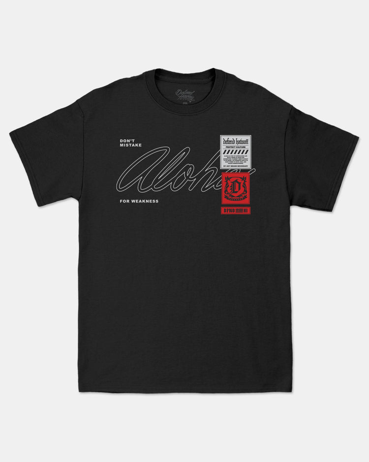 Defend Hawai'i - A new variation in our DMAFW series, Aloha Official. Featuring a scripty Aloha on the chest and two overlapping badges to make it official. Pick your favorite color way. This one comes in red and white ink on a black, gray, or navy regular fit tee.