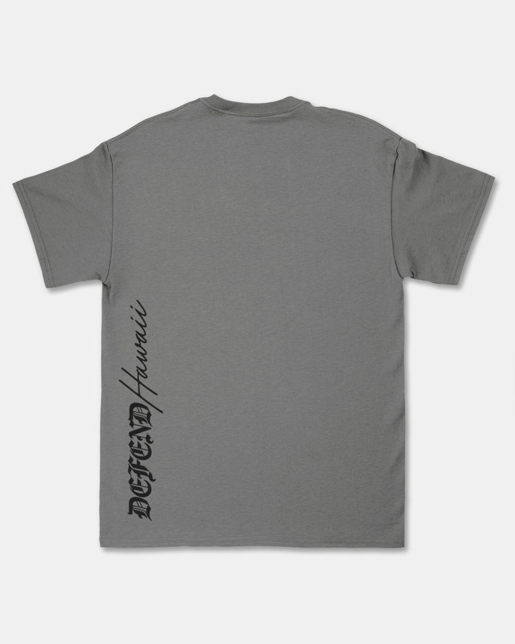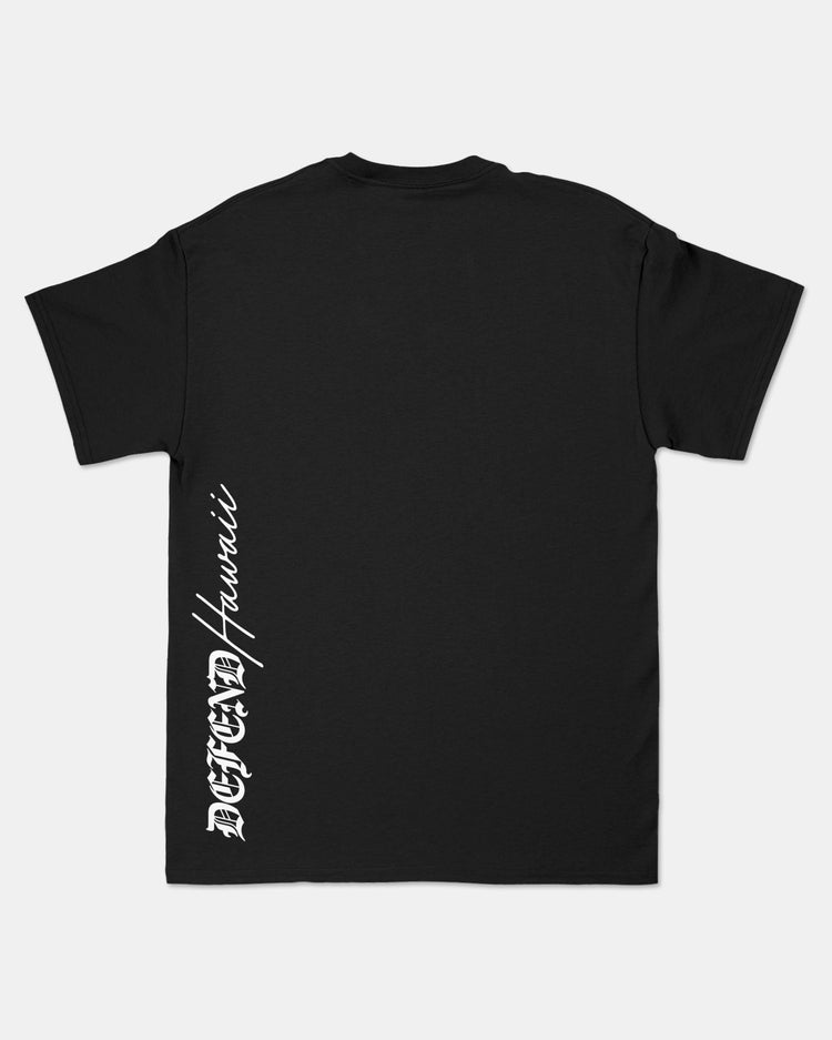 Defend Hawai'i - There's no doubt what the H stands for, this one is H-Spear Script. The look is in the name. Featuring a sharp front hit with our classic H Spear logo, and a clean mission down the side on the back. Pick your favorite color way, this one comes in white ink on black or black ink on gray casual fit t-shirt.