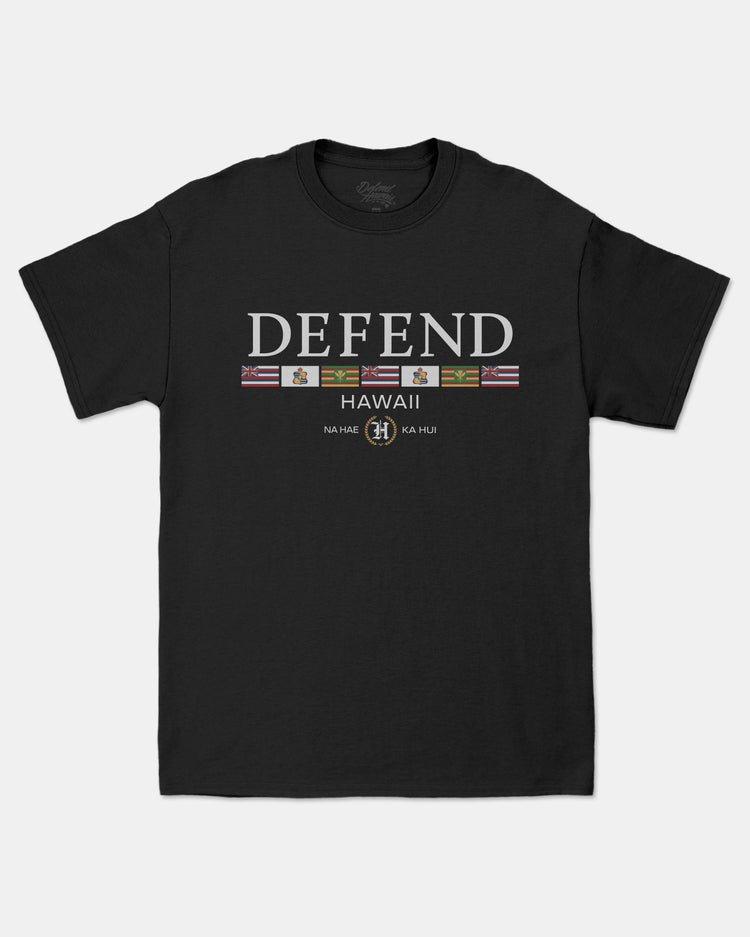 Defend Hawai'i - A new hae rendition featuring the greatest hits. Hae Hits features a center chest hit. Pick your favorite colorway, this one comes in white and multi color ink on a black or navy casual fit t-shirt. Your everyday tee to DEFEND with.