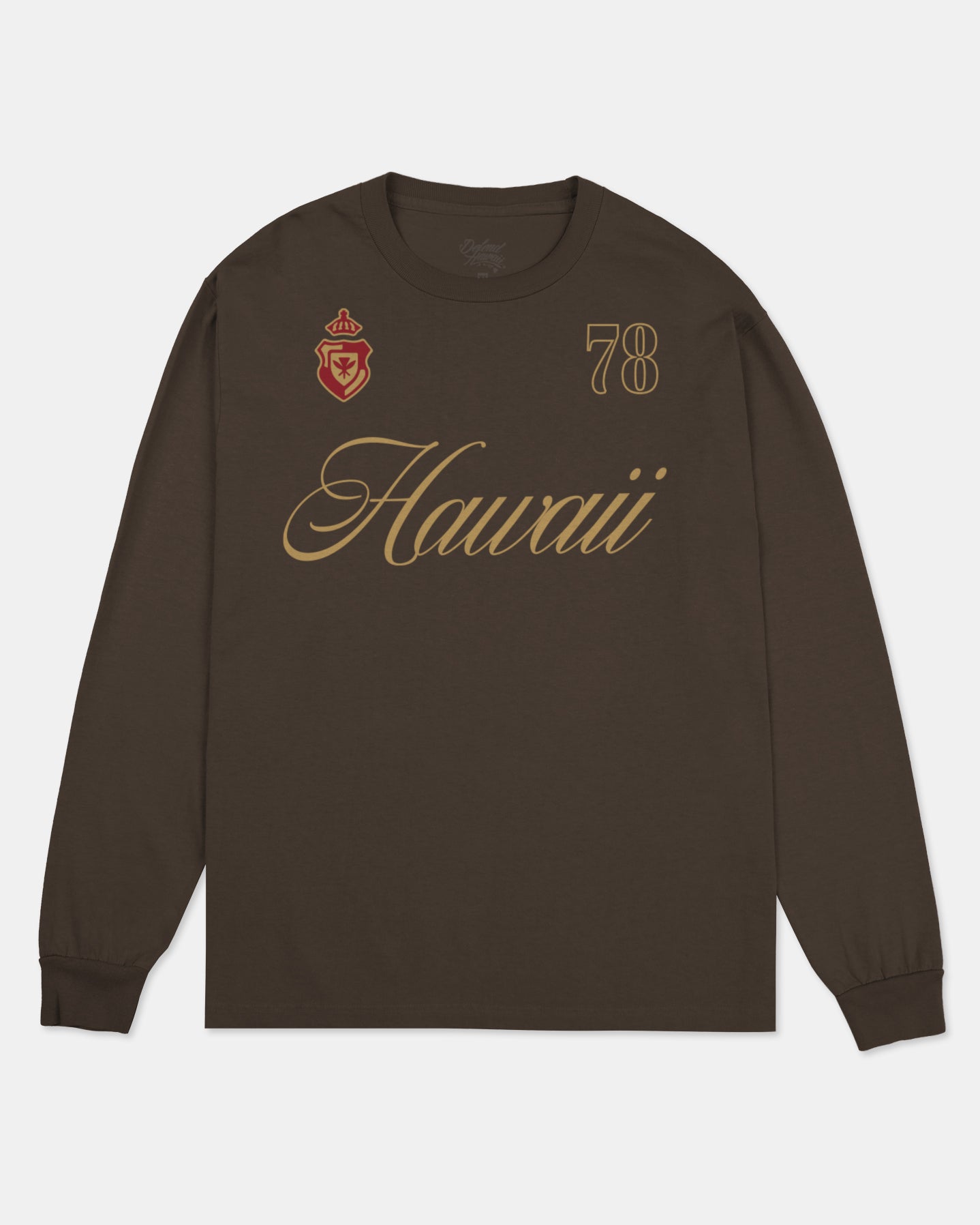 Defend Hawai'i - A clean tee with a scripty font, perfect for a night out or a day at the beach. This is Hawai'i 78. Featuring our home on the chest paired with a couple logo reminders. This one comes in gold and red ink on black or brown casual-fit longsleeve.