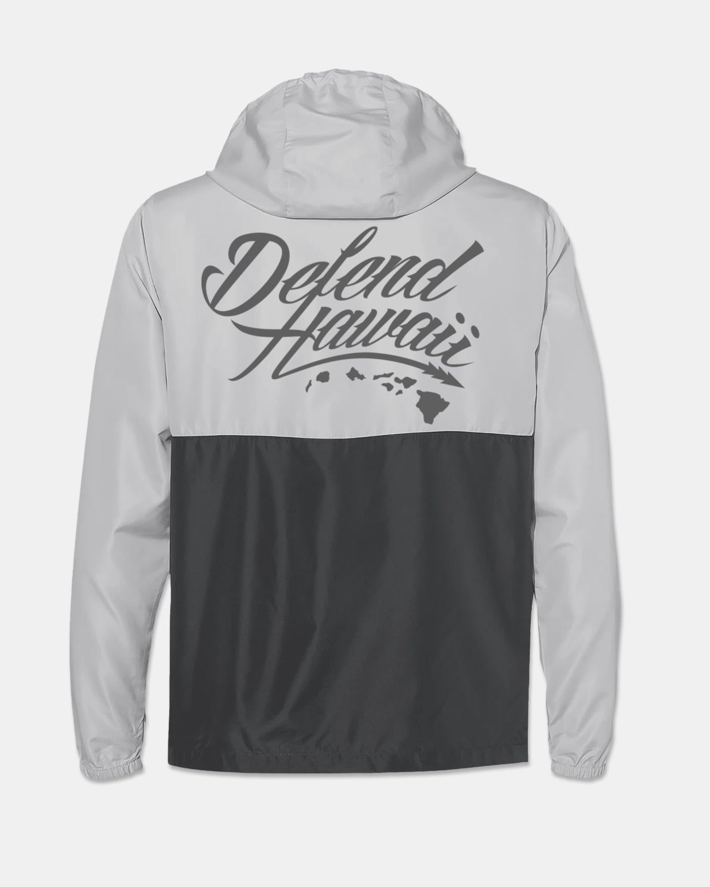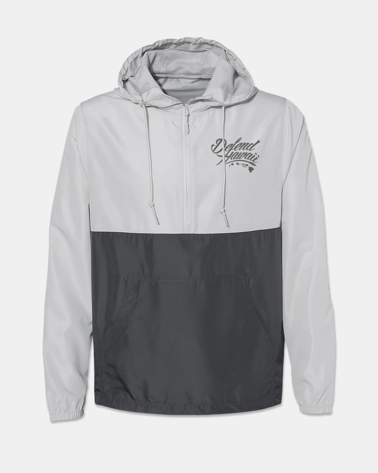 Defend Hawai'i - The iconic, never duplicated, stapled Wildstyle 'Elua logo. Featuring a subtle pocket hit paired with a mayjah back hit in a clean, simple color. This one comes in gray ink on a 2-tone gray nylon anorak windbreaker. Your everyday jacket to DEFEND with.