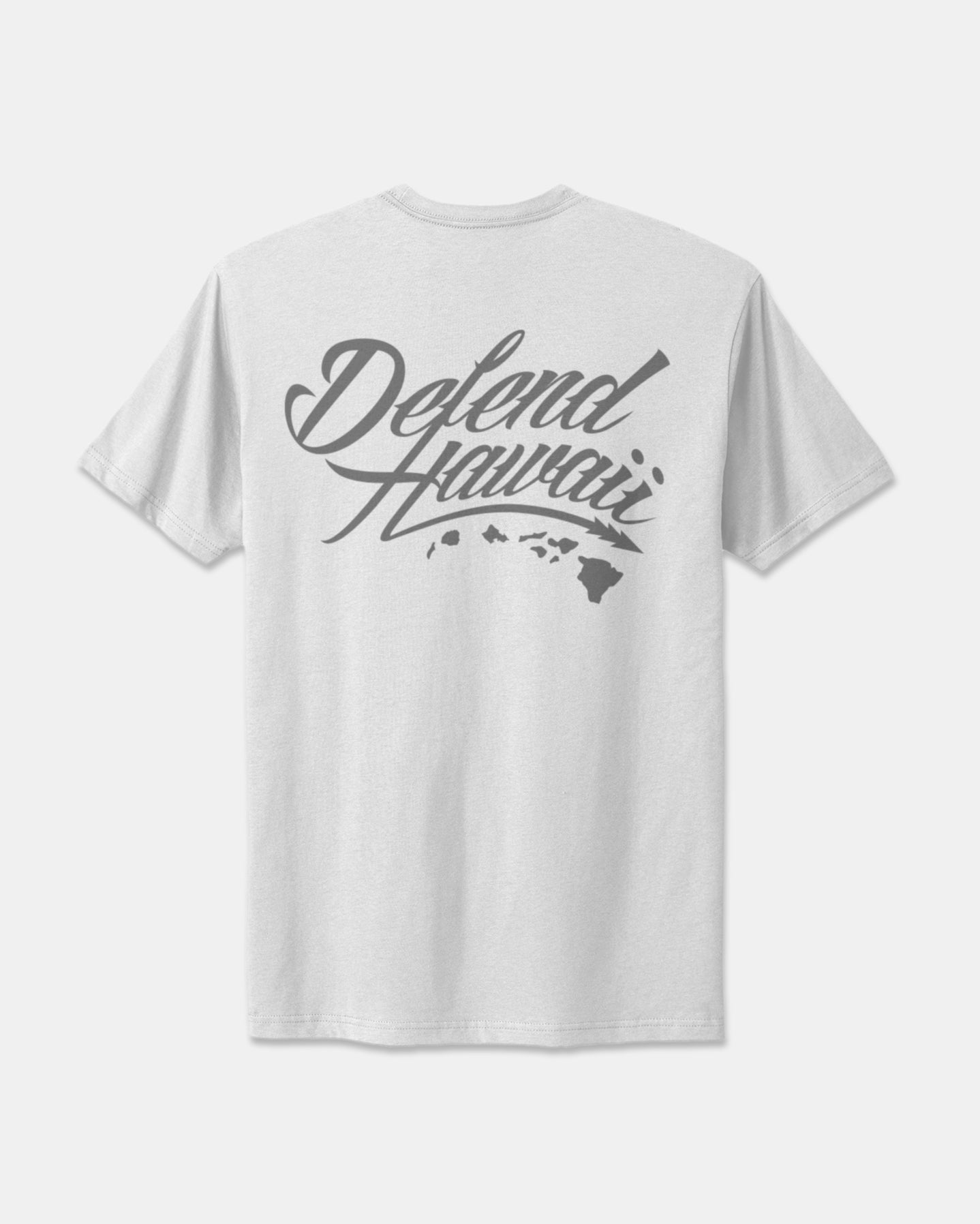 Defend Hawai'i - The iconic, never duplicated, stapled Wildstyle 'Elua logo. Featuring a subtle pocket hit paired with a mayjah back hit in a clean, simple color. This one comes in gray ink on a white premiumfit t-shirt. Your everyday tee to DEFEND with.