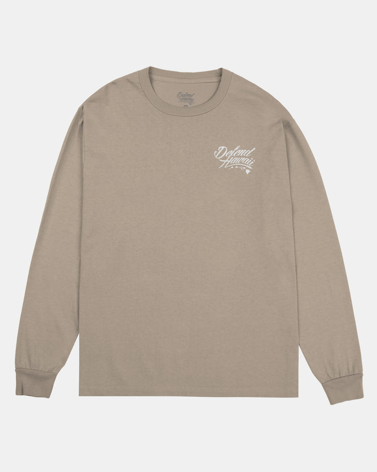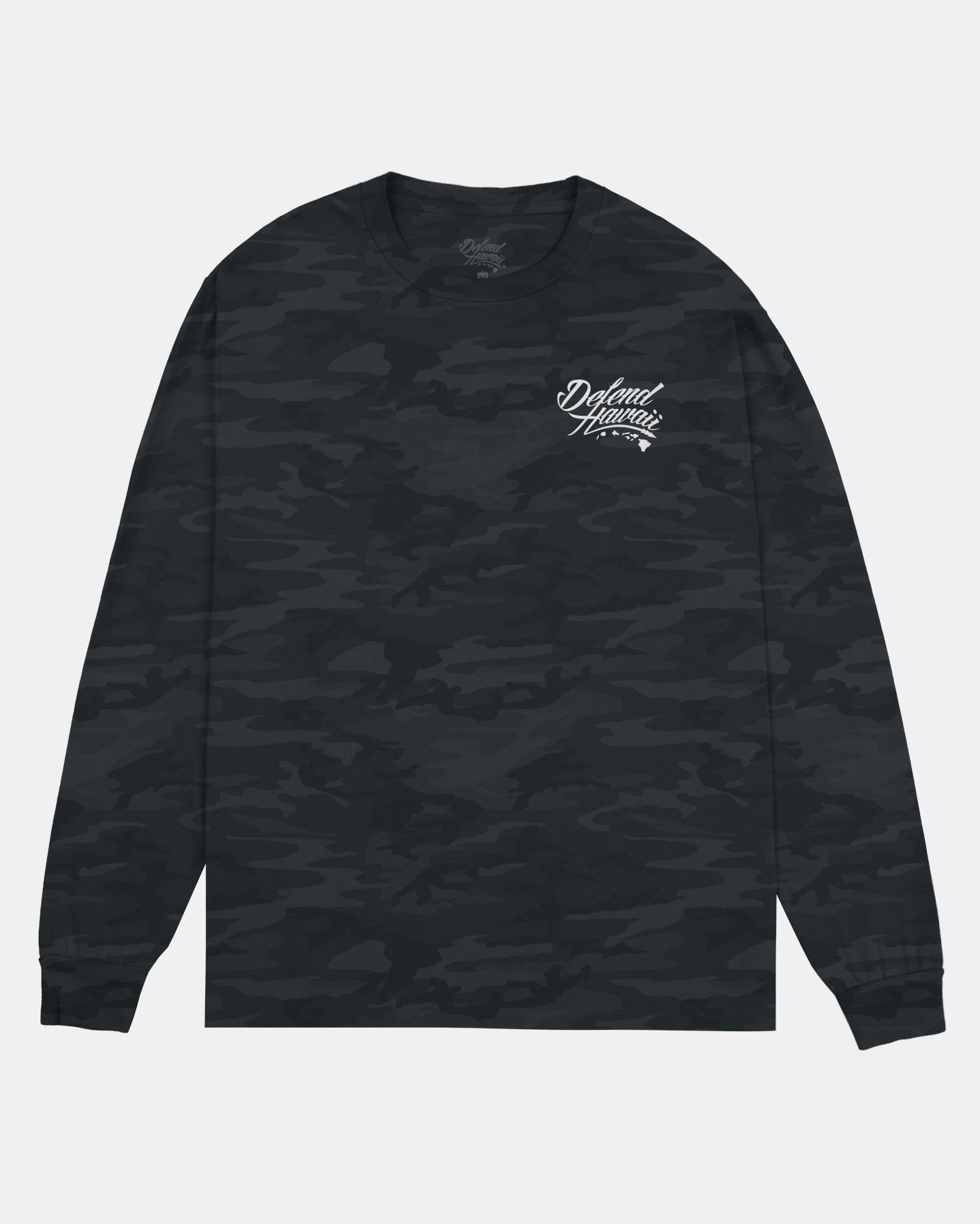 Defend Hawai'i - The iconic, never duplicated, stapled Wildstyle Pocket logo is back. Featuring a subtle pocket hit and a bare back. This one comes in white ink on a light tan or black camo casual fit long sleeve. Your everyday tee to DEFEND with.