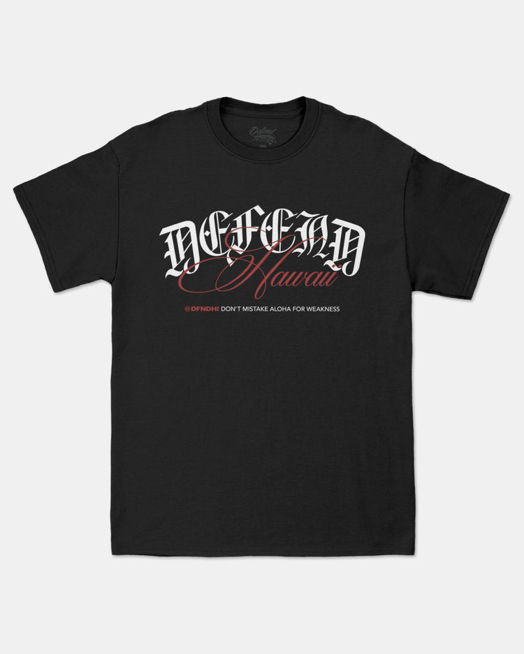 Defend Hawai'i - Introducing BL Script, a full frontal scripty logo with a reminder-By Any Means Necessary. Pick your favorite colorway, this one comes in white and red ink on a black, blue, or athletic heather casual fit t-shirt. Your everyday tee to DEFEND with.