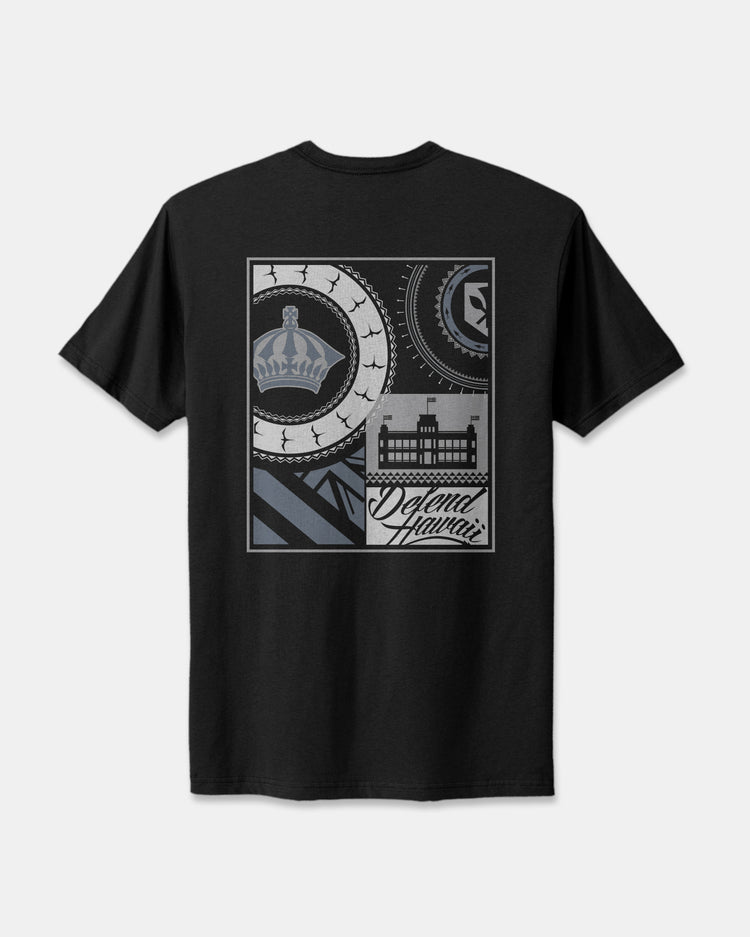 Defend Hawai'i - From the beginning, from our roots.  This collage tells a story. This is Roots Collage '25. Featuring a double logo pocket hit and a collage square back hit. Pick your favorite color way. This one comes in stone blue and gray ink on black premium fit t-shirt.