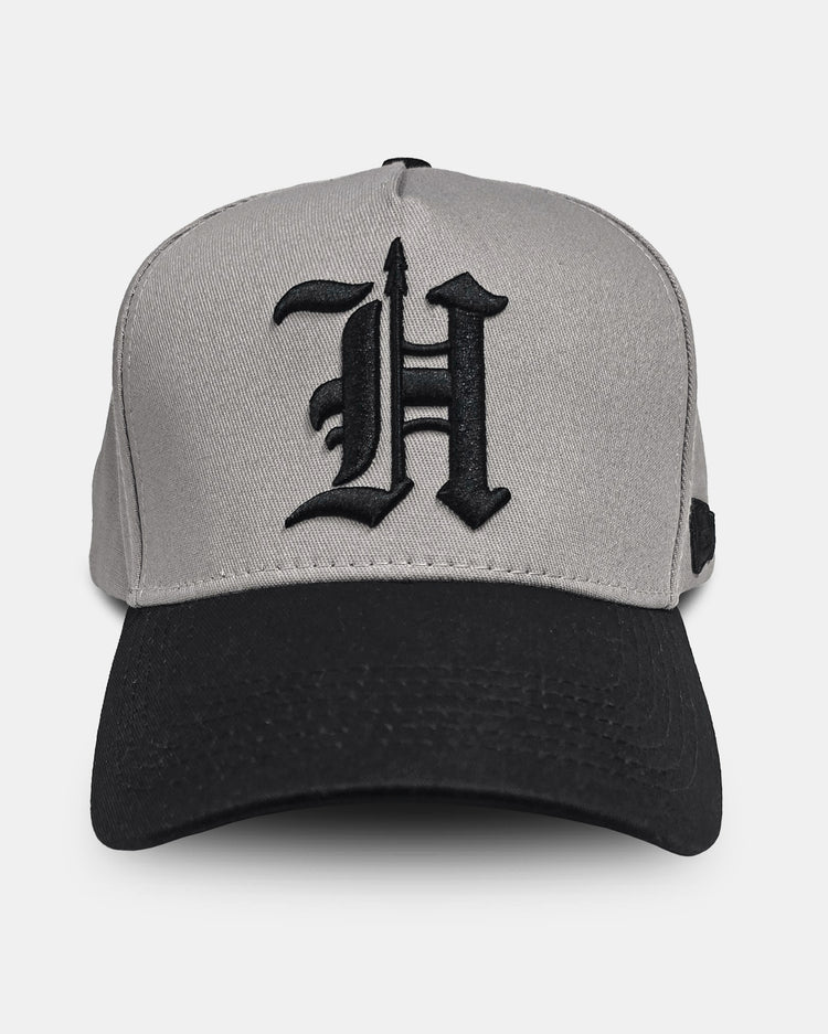 Defend Hawai‘i - Bringing back our staple headwear, featuring the beloved H Spear design. This time embroidered in black on a gray a-frame snapback. A hae Hawai'i (Hawaiian flag) patch embroidered on it's side. This one is a cotton a-frame snapback hat, with a gray crown, black eyelets, black brim, and button with a snap closure.